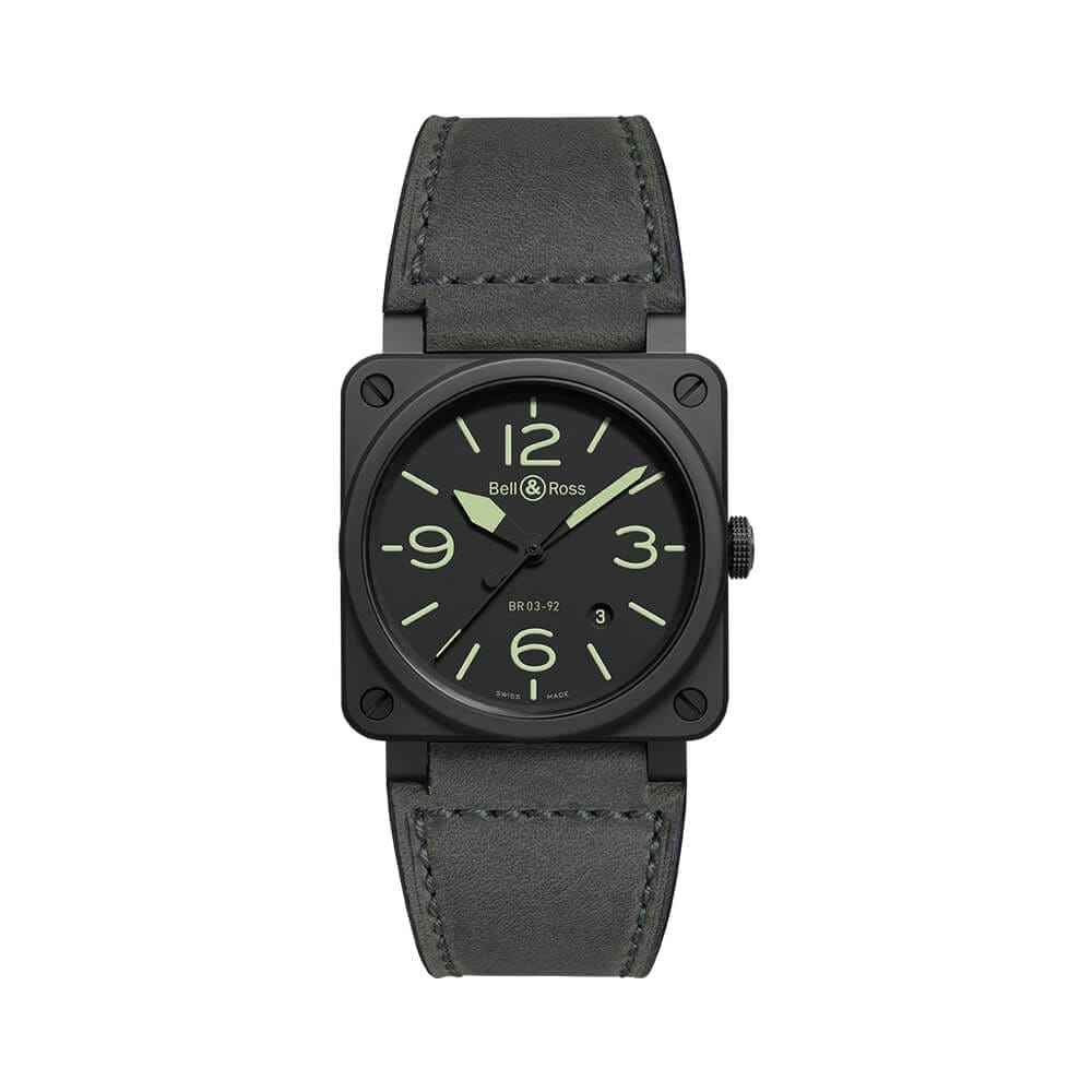 This men’s Bell & Ross Nightlum watch features a black dial and black case color, with a 42mm case size and stainless steel case type. The strap is made of leather and has a gray-green color. It has an automatic movement and a Sport style, with a black bezel and BR-CAL.302 caliber. Model number is BR03-92-BL3-CE/SCA.