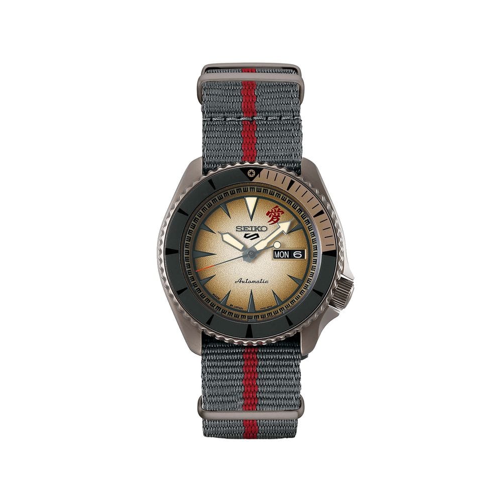Introducing the Seiko 5 Sports Naruto/Boruto Limited Edition Gaara SBSA093, a stunning timepiece inspired by characters from the internationally popular anime series Naruto and his son Boruto, featuring a brown finish stainless steel case, gray color strap with red stripe, and a special collector’s box inspired by the Earth and Heaven Scrolls from the Chunin Exams, all while boasting automatic winding capabilities, a sand patterned dial, LumiBrite hands and markers, and water resistance up to 100 meters.